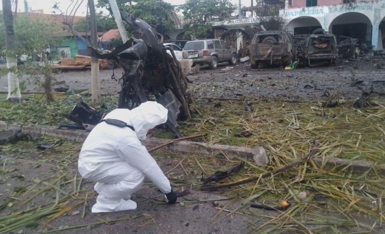 Este domingo los alrededores del cuartel de la Policía Comunitaria donde ocurrió la explosión están cercados por un perímetro policial dentro del cual hay al menos 15 peritos del Centro Federal Pericial Forense (CFPF) y 11 policías federales ministeriales, ambos de la Agencia de Investigación Criminal (AIC), de la FGR.