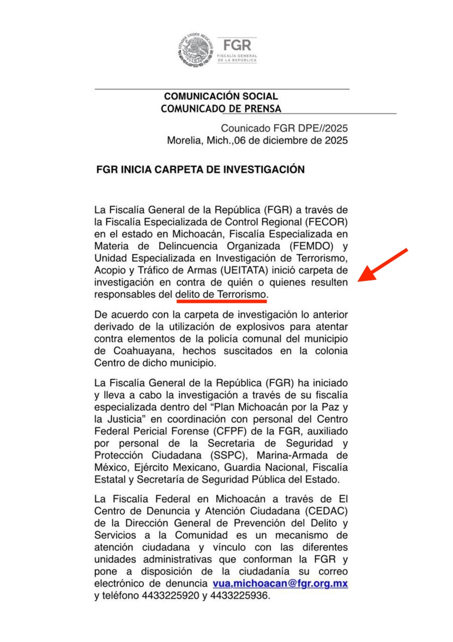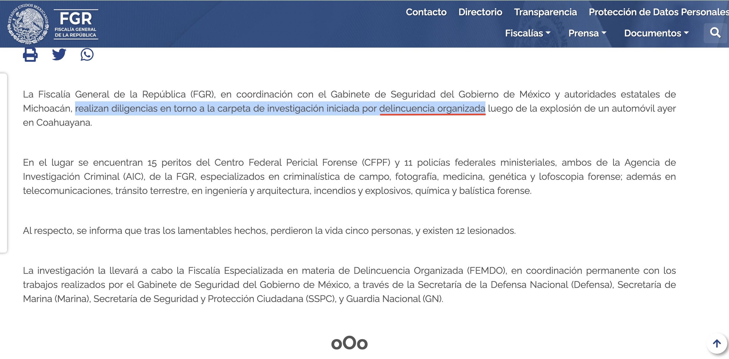 El nuevo comunicado dice: “La Fiscalía General de la República (FGR), en coordinación con el Gabinete de Seguridad del Gobierno de México y autoridades estatales de Michoacán, realizan diligencias en torno a la carpeta de investigación iniciada por delincuencia organizada luego de la explosión de un automóvil ayer en Coahuayana”.